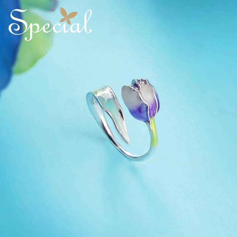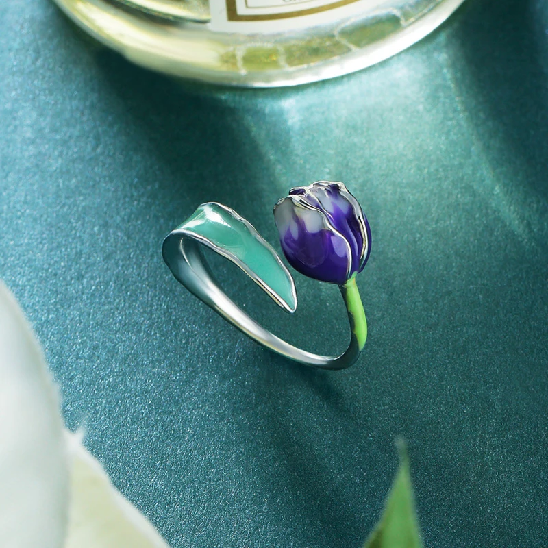Review Special Brand Fashion Enamel Flower Rings Purple Tulip End Open Rings Size Adjustable Jewelry Gifts